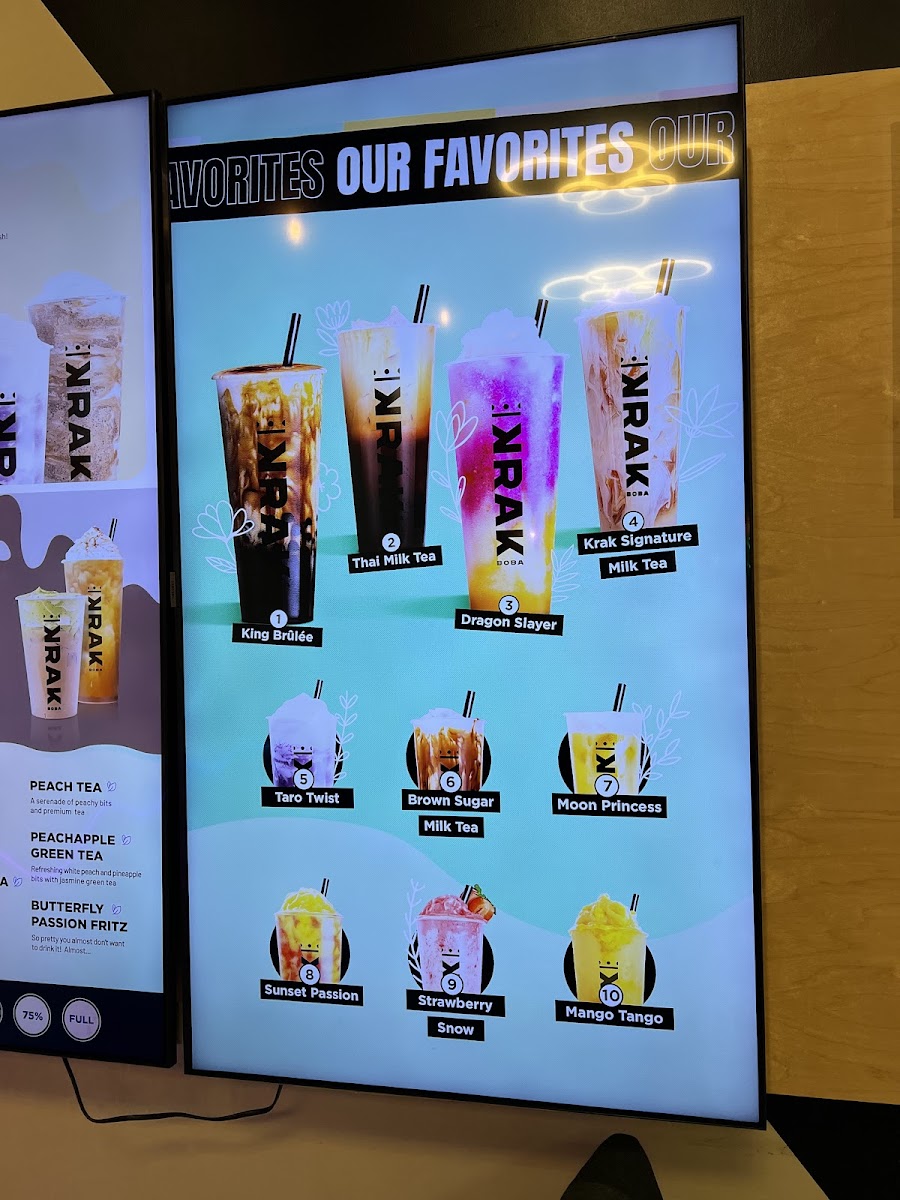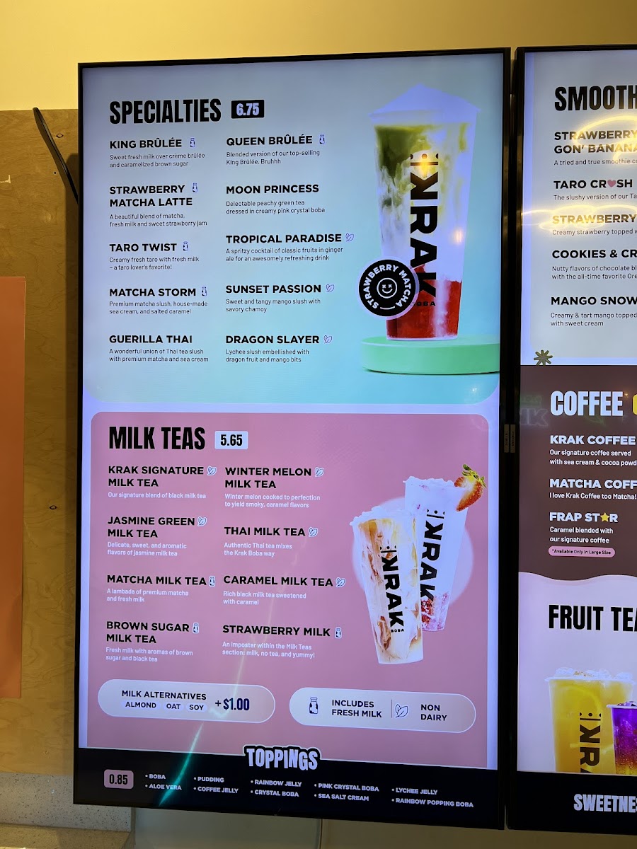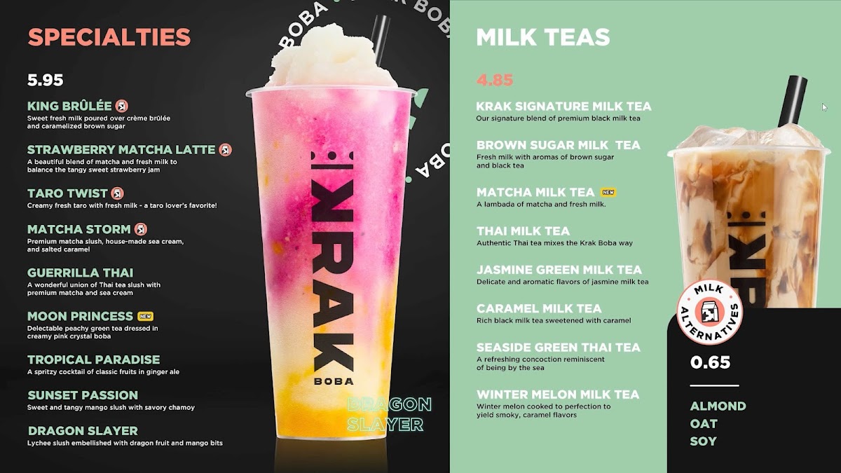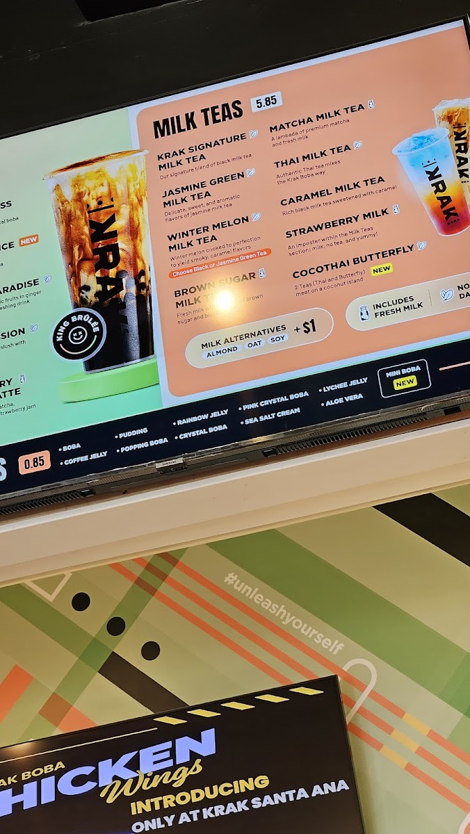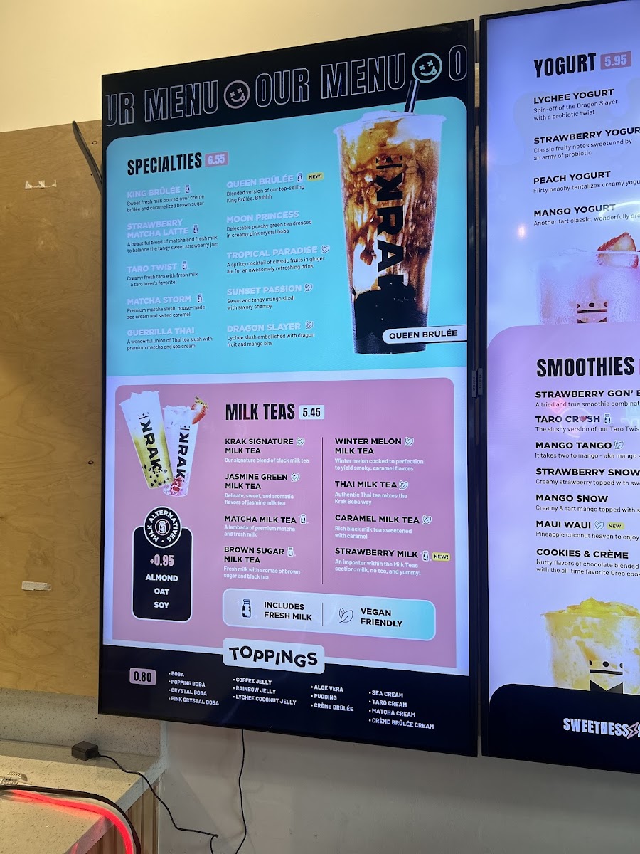 Krak Boba Santa Ana offers a diverse and indulgent menu that caters to a wide range of tastes. Their King Brulee On Ice (Large) and King Brulee Blended (Aka Queen Brulee - Large) are standout specialty drinks, offering a rich and creamy experience. For those with a sweet tooth, the Strawberry Matcha Latte (Large) and Taro Ocean (Large) provide delightful and refreshing flavors. If you're in the mood for something with a bit of a kick, the Matcha Storm (Large) will surely impress. The milk tea section is equally enticing, with options like the Krak Signature Milk Tea (Non-Dairy, Large) and Brown Sugar Milk Tea (Large). For fruit tea lovers, there's a variety of vibrant choices, including the Cosmos Serenade (Large) and Peachapple Green Tea (Large). Smoothie enthusiasts can enjoy refreshing blends such as the Strawberry Gon' Bananas (Non-Dairy, Large) and Mango Tango (Non-Dairy, Large). The coffee selection adds another layer of flavor with indulgent options like the Krak Coffee - Taro Cream and Krak Coffee - Matcha Cream. The secret menu features intriguing beverages like the Moon Princess (Large) and Tropical Paradise (Large), which offer a touch of mystery and excitement. For those looking for something savory, the food menu includes crispy Truffle Fries, flavorful Garlic Butter Wings (5 Pieces), and classic Mozzarella Sticks (5 Pieces). With a wide variety of drinks and snacks, Krak Boba Santa Ana provides something for everyone to enjoy.