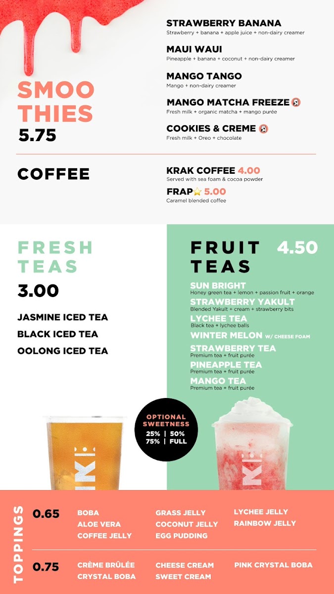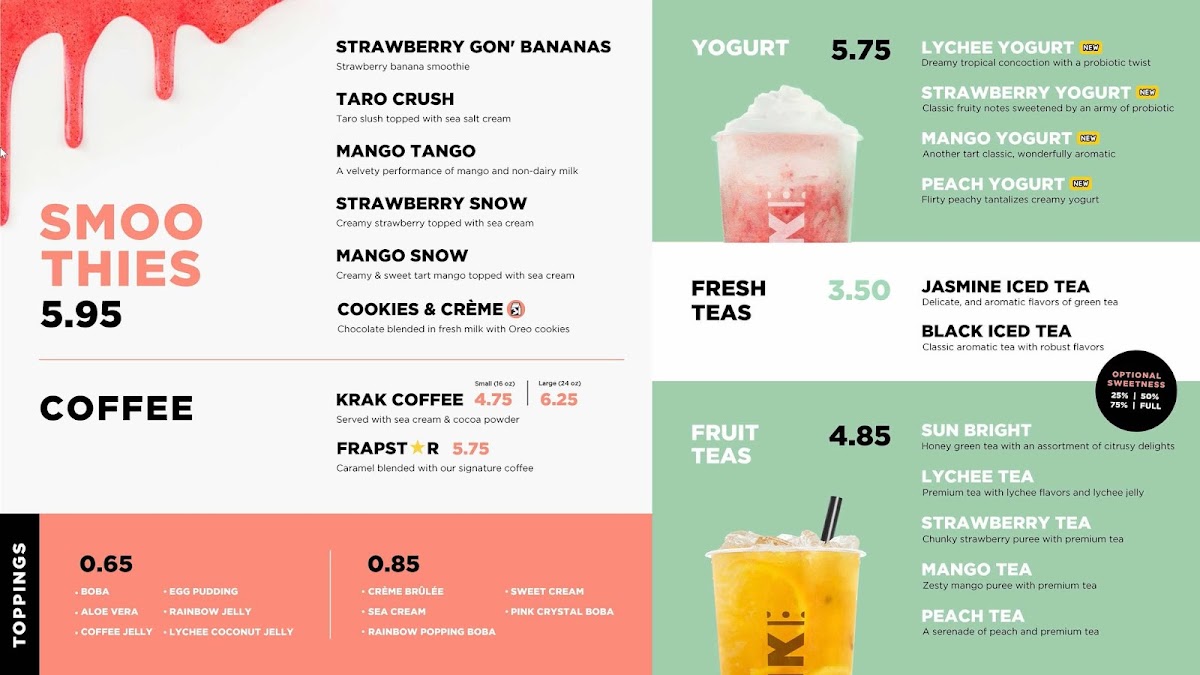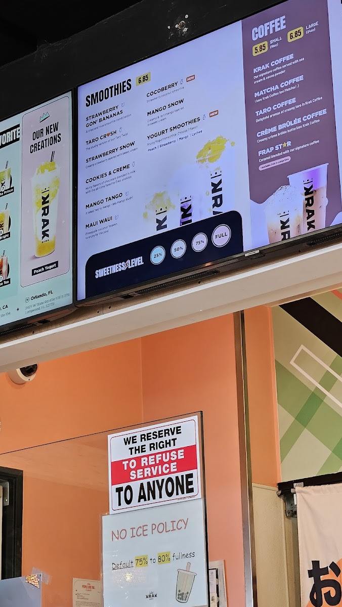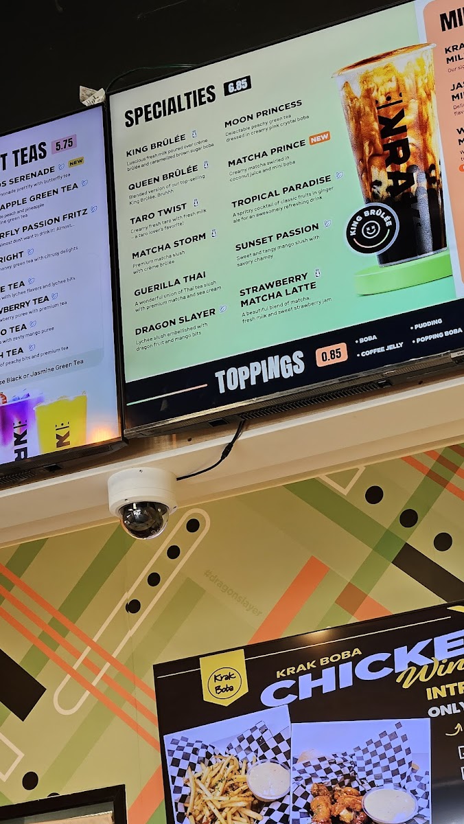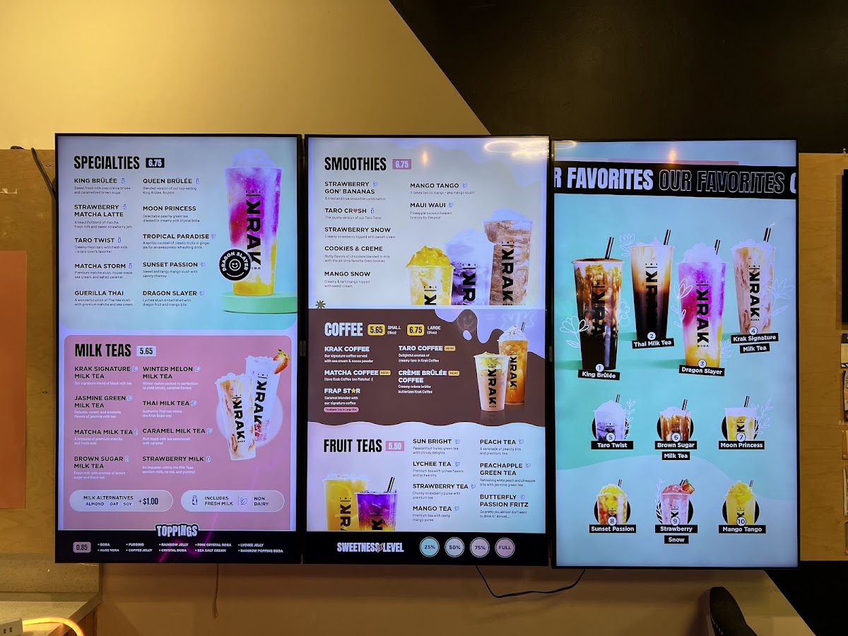 Krak Boba Santa Ana offers a diverse and indulgent menu that caters to a wide range of tastes. Their King Brulee On Ice (Large) and King Brulee Blended (Aka Queen Brulee - Large) are standout specialty drinks, offering a rich and creamy experience. For those with a sweet tooth, the Strawberry Matcha Latte (Large) and Taro Ocean (Large) provide delightful and refreshing flavors. If you're in the mood for something with a bit of a kick, the Matcha Storm (Large) will surely impress. The milk tea section is equally enticing, with options like the Krak Signature Milk Tea (Non-Dairy, Large) and Brown Sugar Milk Tea (Large). For fruit tea lovers, there's a variety of vibrant choices, including the Cosmos Serenade (Large) and Peachapple Green Tea (Large). Smoothie enthusiasts can enjoy refreshing blends such as the Strawberry Gon' Bananas (Non-Dairy, Large) and Mango Tango (Non-Dairy, Large). The coffee selection adds another layer of flavor with indulgent options like the Krak Coffee - Taro Cream and Krak Coffee - Matcha Cream. The secret menu features intriguing beverages like the Moon Princess (Large) and Tropical Paradise (Large), which offer a touch of mystery and excitement. For those looking for something savory, the food menu includes crispy Truffle Fries, flavorful Garlic Butter Wings (5 Pieces), and classic Mozzarella Sticks (5 Pieces). With a wide variety of drinks and snacks, Krak Boba Santa Ana provides something for everyone to enjoy.